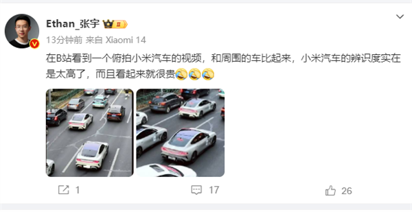 博主曬小米汽車俯拍圖:辨識度太高了 看起來就很貴
